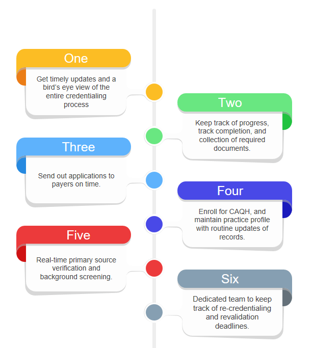 We track the completion and collect the necessary documents; complete the credentialing process; send applications to payers; and then swiftly respond to all requests for corrections or any additional information from payers. At PR Solutions, we assign a team of expert to track re-credentialing deadlines and initiate, and complete the process each time your practice is due for re-credentialing.